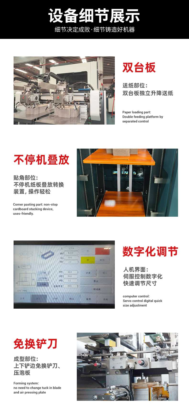 雙臺(tái)板獨(dú)立升降送紙◆不停機(jī)紙板疊放轉(zhuǎn)換裝置◆操作輕松◆伺服控制數(shù)字化快速調(diào)節(jié)尺寸◆上下鏟邊免換鏟刀、壓泡板