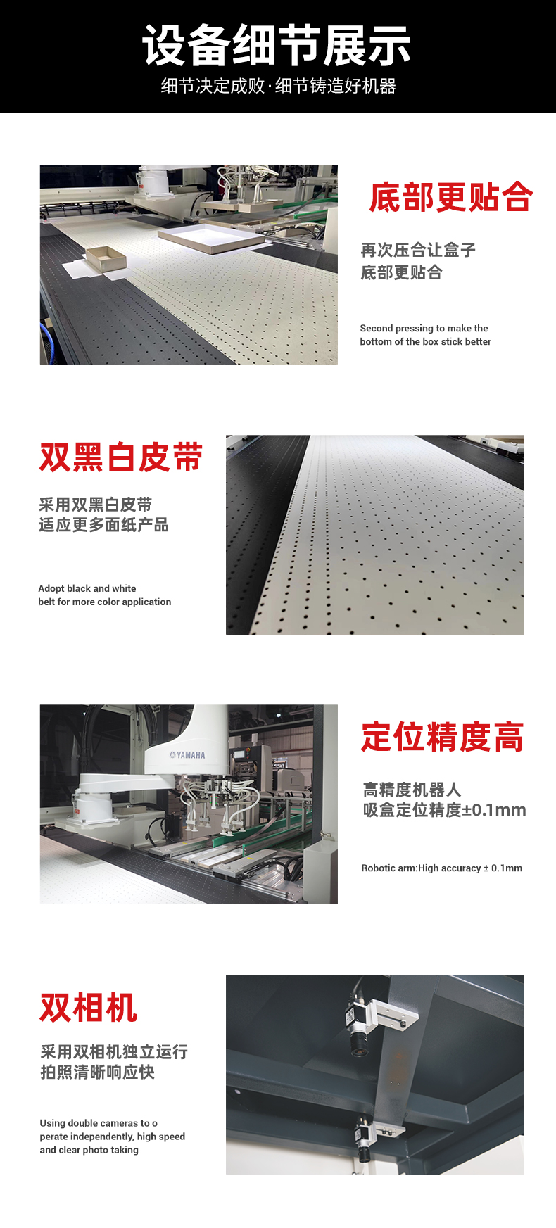 再次壓合讓盒子底部更貼合◆采用雙黑白皮帶適應更多面紙產(chǎn)品◆高精度機器人吸盒定位精度±0.1mm◆采用雙相機獨立運行拍照清晰相應快
