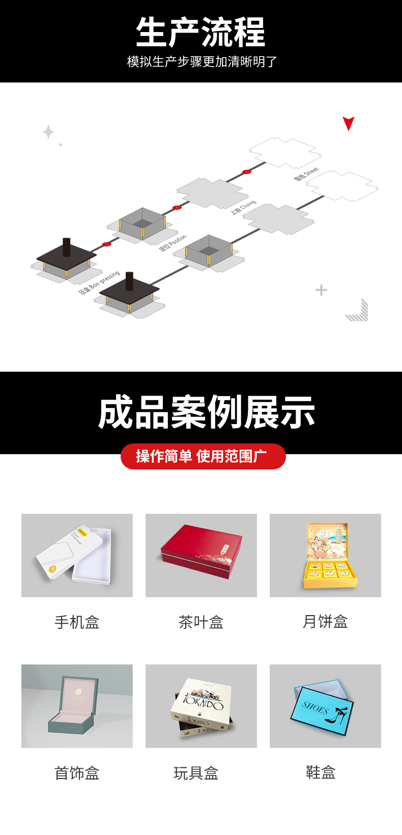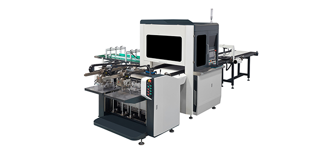本機是加工精裝盒,天地盒的理想自動化設備,通過人工在流水線上將內(nèi)盒和面紙定位好,再將定位好的紙盒放進機器木模上,機器自動運行,糊盒、折邊壓泡一次性完成。每分鐘可生產(chǎn)精裝盒多達30個,大大提高了精裝盒的生產(chǎn)效益,節(jié)省了生產(chǎn)成本。因每個動作都是機械式完成,使產(chǎn)品標準化生產(chǎn),大大提高了產(chǎn)品的質(zhì)量。